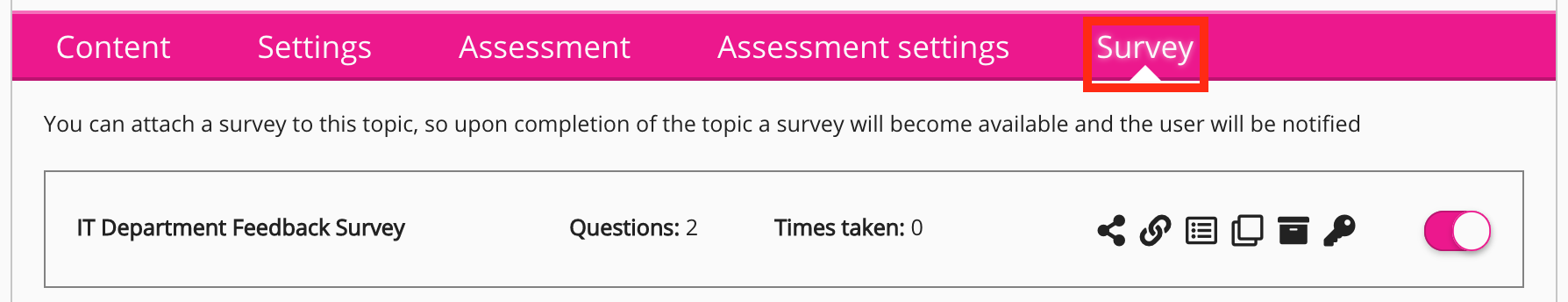 The Survey tab allows you to attach an existing survey to the topic, as well as edit, copy, archive, and delete a survey, as well as manage access settings. When a user completes the topic, the survey will become available.