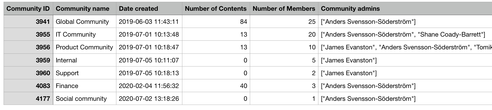 Date created | The date the community was created. |