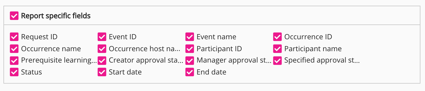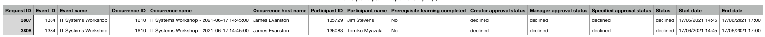 Manager approval status | Whether or not the user's manager approved the user to participate in the event. The following can be displayed in the report:
