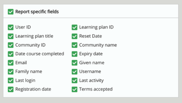 Select fields to include in the report | Select data you want to include in the report/deselect data you want to omit from the report. For more details on each of these fields, see the Report specific fields section below. ![]() |