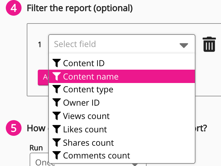 How often would you like to run this report? | Select how often you would like to run the report. Example: You may only want to run the report once, or you might want to run it on a monthly basis to keep track of learning completion for users in the community. From the Run drop down, select one of the following: