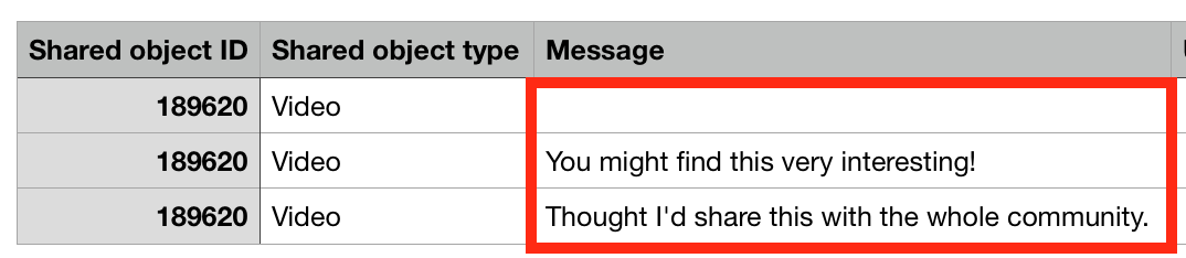 Message | If the user who shared the content has written a message, it will be displayed in this column. |