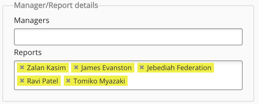 A manager-reportee relationship must exist between two users in order to use evidence portfolios. Admins can specify a manager-reportee relationship in the Manager/Report details section of each user's Personal settings screen. For more information, see Manage users.