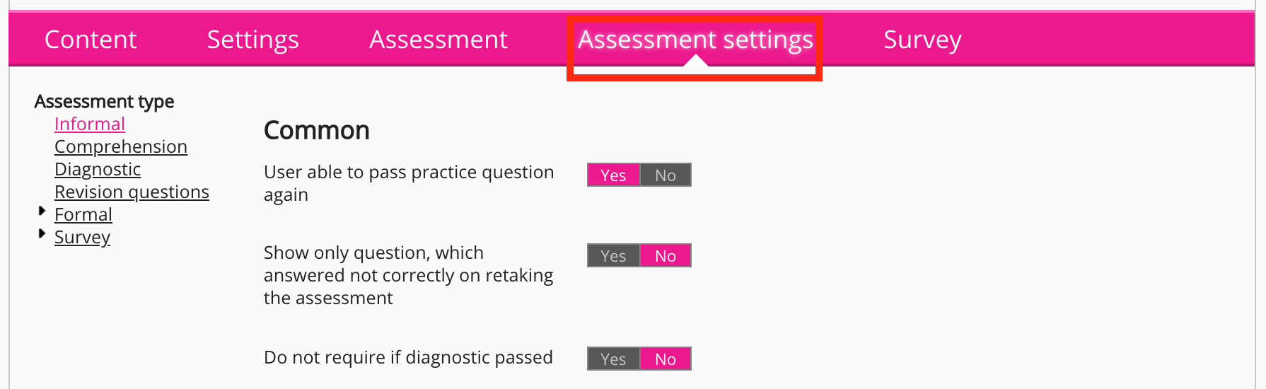The Assessment settings tab allows admins to configure settings for informal, comprehension, diagnostic, and formal assessments, as well as surveys.