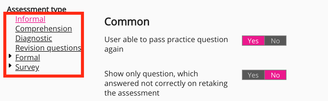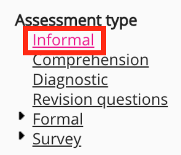 The Informal assessment type is always selected when navigating to or refreshing the Assessment settings tab. Settings selected for other assessment types are still saved.