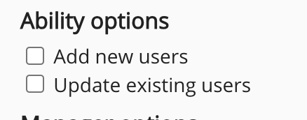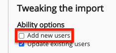 The Tweaking the import screen appears.Under Ability options, deselect the Add new users option.