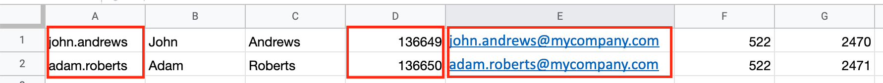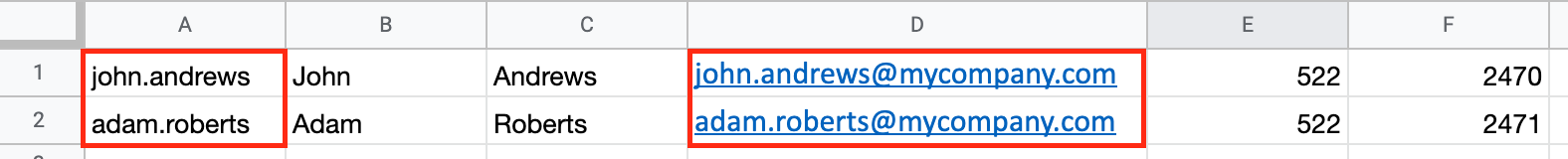 Column C: In this column of the CSV, you must enter the email addresses OR usernames of the users you wish to deactivate. Please note that you cannot have a mixture of email addresses and usernames in this column; you must choose either the email addresses or usernames for the specified users. A mixture email addresses and usernames will cause the import to fail.