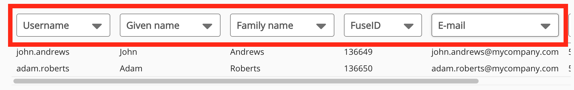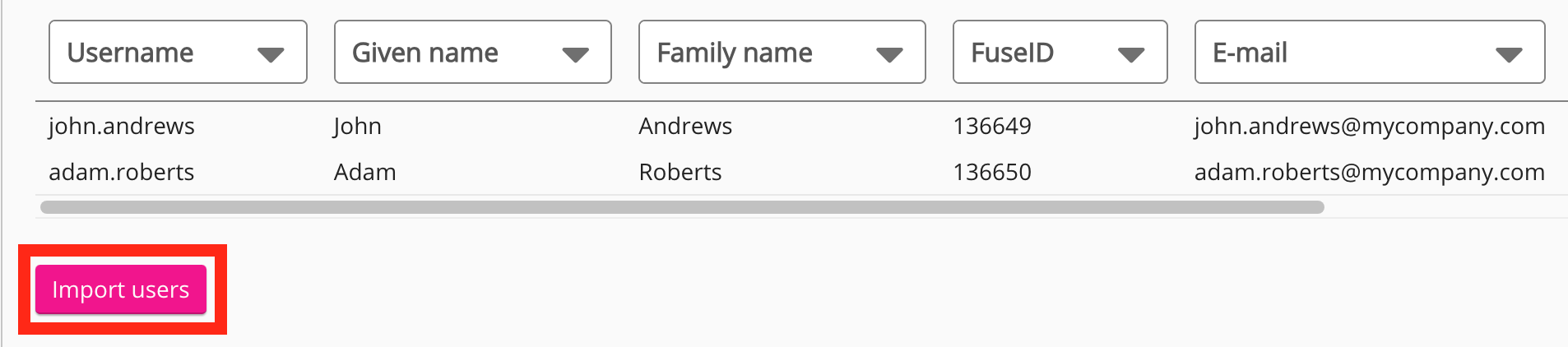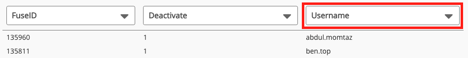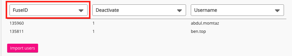 When making changes to existing users, the CSV file must contain the user's username, email address or Fuse ID (User ID).
