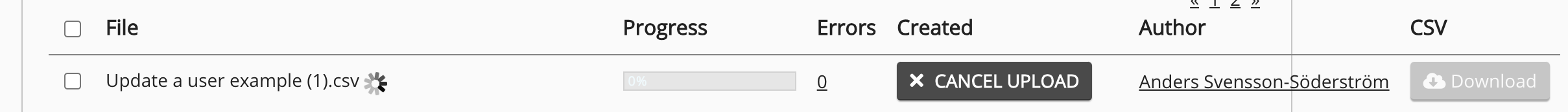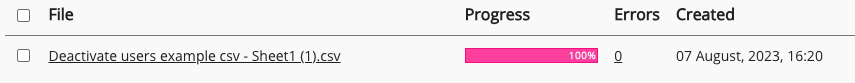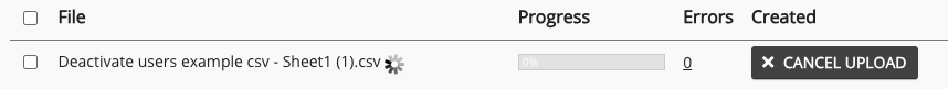 The CSV starts importing.Refresh the page until the import has completed. Once the import has completed, you can check that the specified users have been deactivated on the Manage users screen.