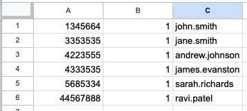 Column B: In this column of the CSV, you must enter a number 1 for each user.