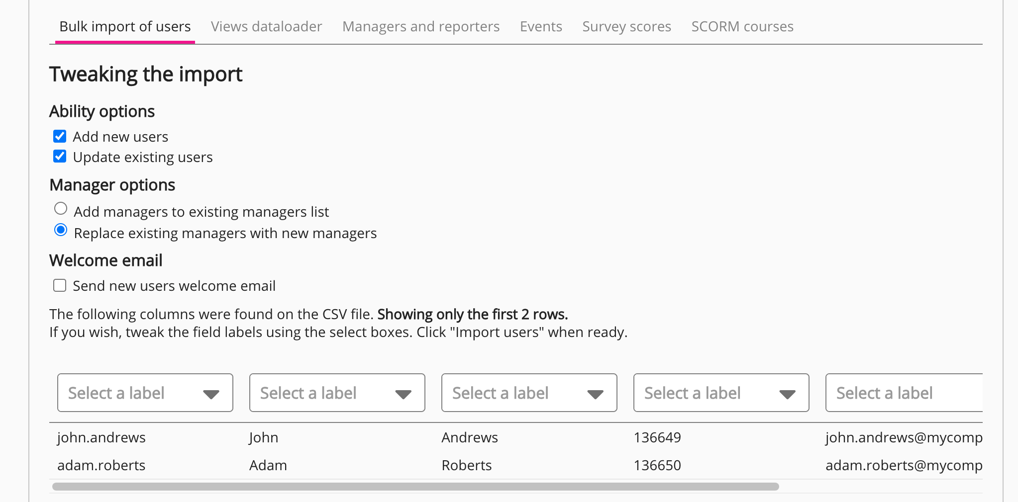 Progress | Displays the current user import progress. For example, if the import has completed, the progress bar will show 100%. ![]() If labels have not been assigned to each of the user details in the CSV, click Adjust labels to start to assign labels before importing can complete. |