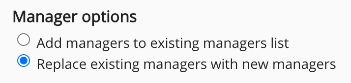 Replace existing managers with new managers: Users marked as ‘managers' in the CSV file will replace any existing managers that are already listed in the Managers field in the reportee’s Personal settings screen.