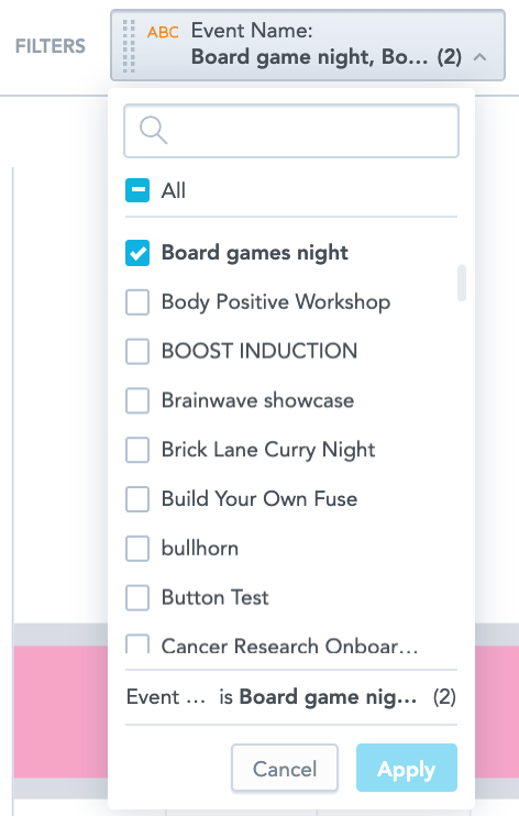 Drag Event Name from the Data Catalogue, into the Filters section. Then select a particular event from the dropdown.