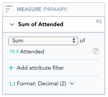Drag Number of Users Attended from the Data Catalogue, into the Metric (PRIMARY) section.