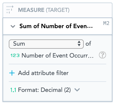 Ensure that Sum is selected, so that the total number of users attending the event is displayed.Drag Number of Event Occurrence Seats from the Data Catalogue, into the Metric (Target) section.