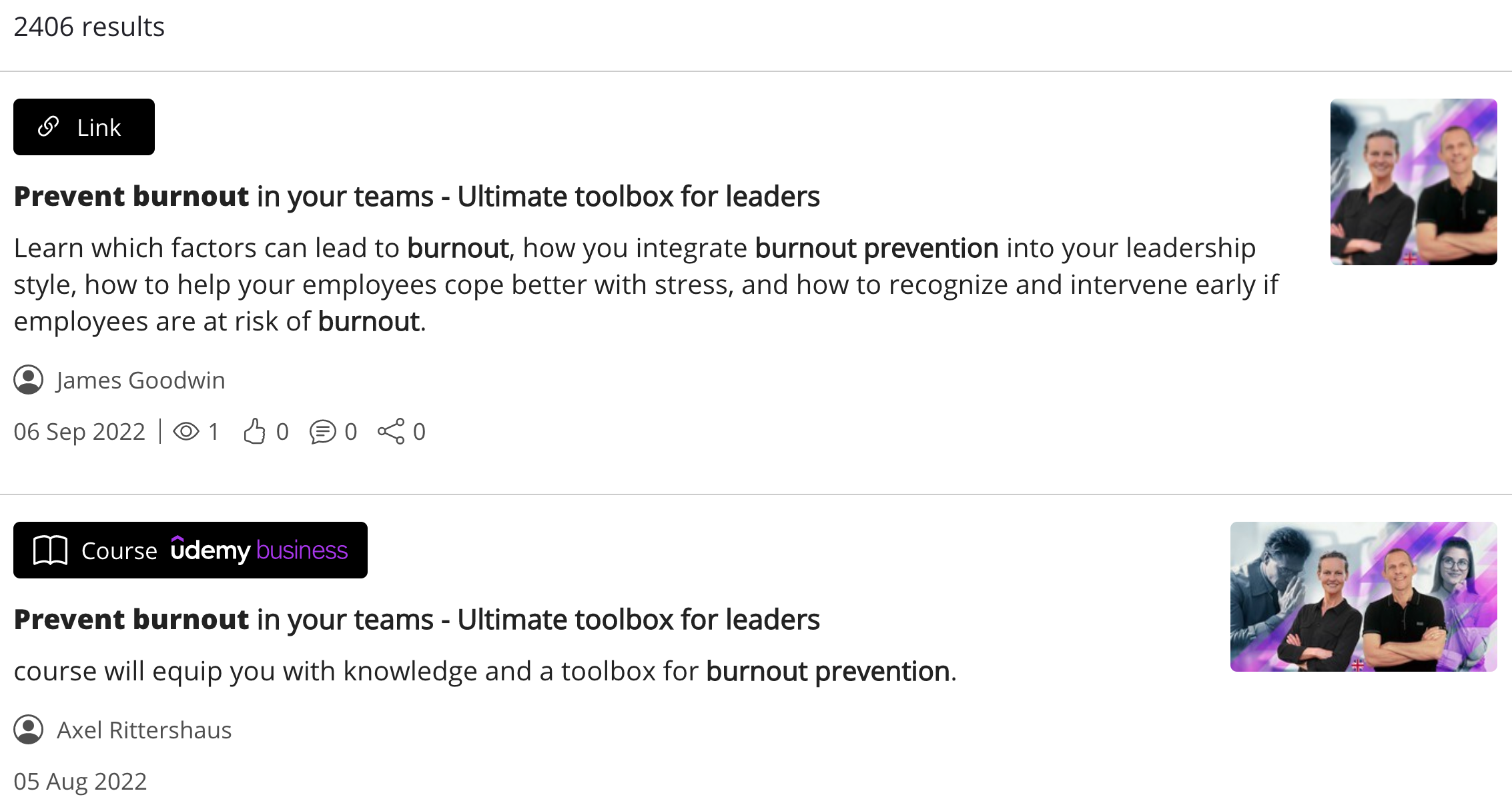 If you choose to do this, the Udemy for Business course will appear twice in search results: