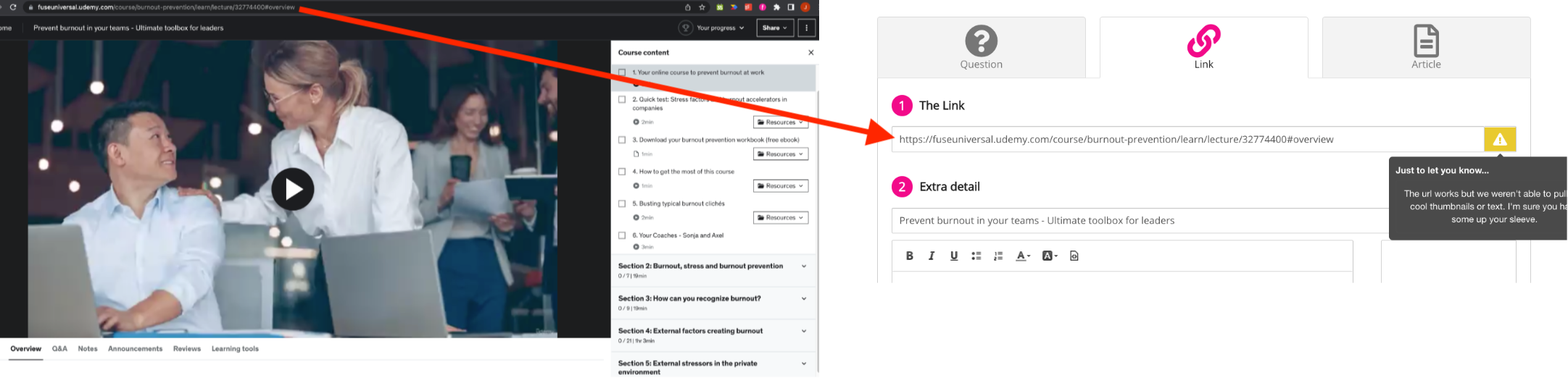 Ordinarily, Fuse automatically extracts a title, thumbnail and description from URLs. This is currently not possible for Udemy for Business URLs. This information must be entered manually before posting to Fuse.