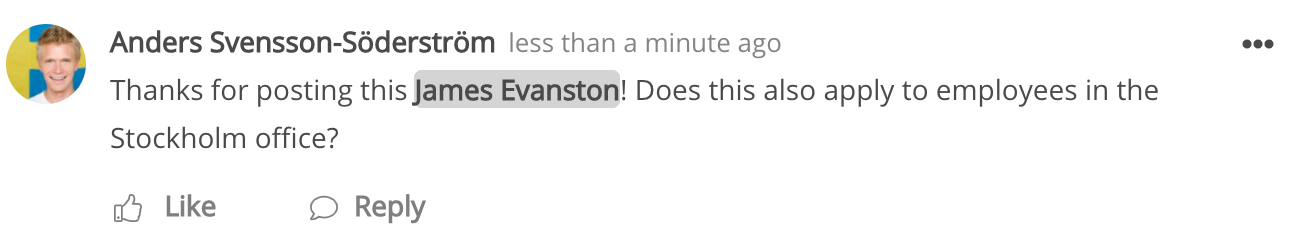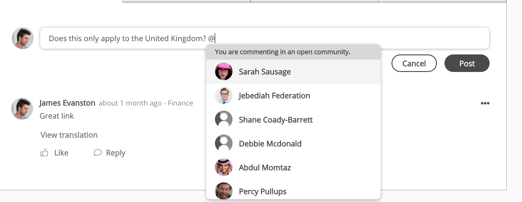 Open | If the content exists in an open community, any user in Fuse can be mentioned in the comment, even if they are not a member of that open community. |