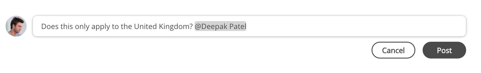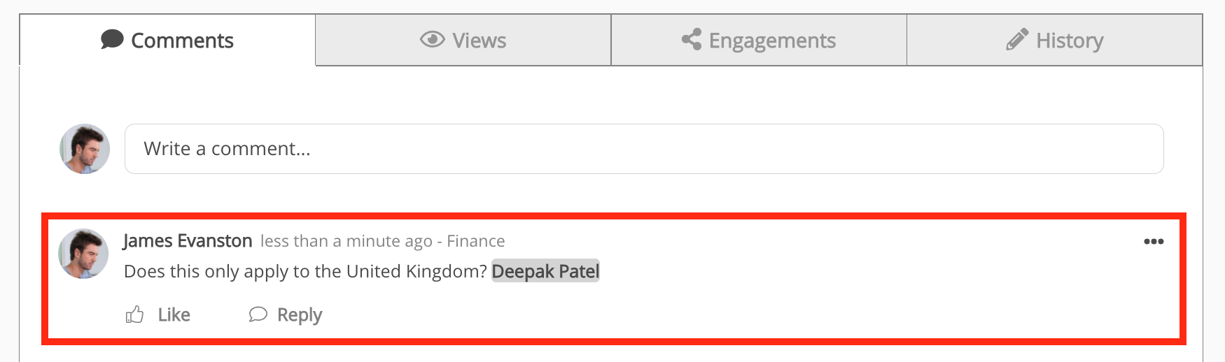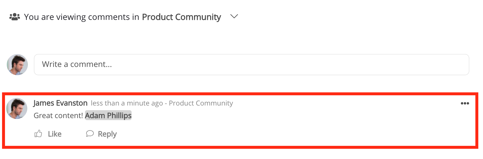 A label is displayed above each comment indicating where it has been posted. In the example below, the comment is only visible in ‘Product Community’.