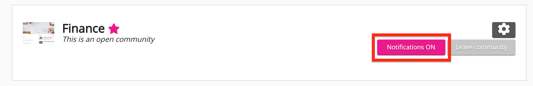 When notifications are enabled in a community, the Notification button in the top-right corner of the community homepage shows as Notifications ON.