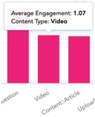Average Engagement per Content Item | Shows the average engagement per item of content, broken down by content type, based on filters selected in the Filter By section. ![]() In the example below, the average engagement for video content in the Fuse instance is 1.07. Hover over each bar in the chart to see the details for a specific content type. ![]() |