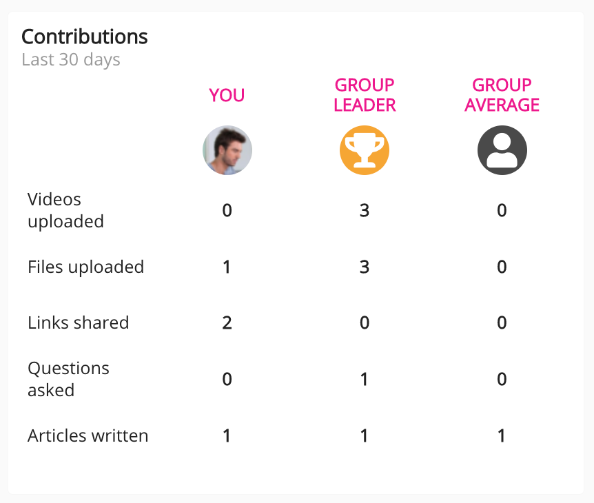Prior to deprecation, the Contributions widget could be added to the User Dashboard page in Design Studio and compared your contributions against the group leader and group average (all users across Fuse) over the last 30 days.