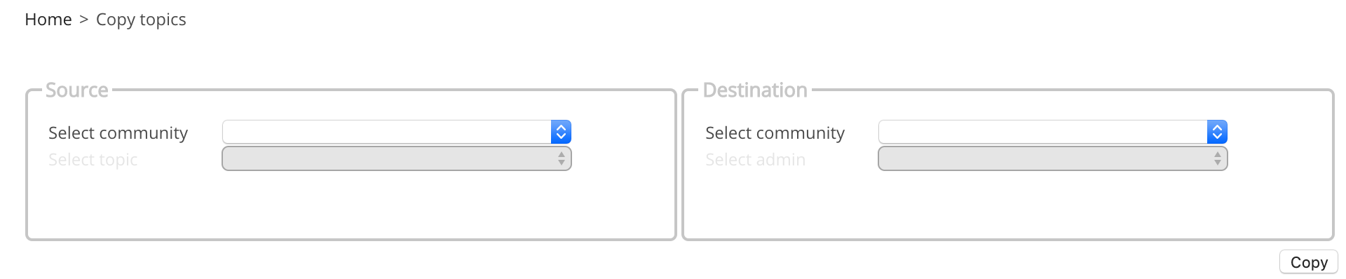 The Copy topics screen on the Admin Panel allows you to copy topics from one community to another.