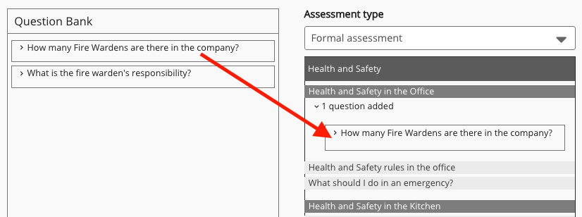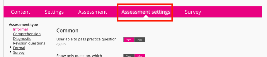 Please note that there are two distinct ways of attaching questions to chapters/items of content within assessments. If you drag and drop each question over the title of a chapter/item of content, each question is listed individually, and it becomes mandatory for users to answer each question that is listed. If you drag and drop each question on top of one another, they will be grouped together underneath the chapter/item of content, which results in users being asked one of these questions at random. For more information, see Adding a question to a chapter/item of content.Click the Assessment settings tab.