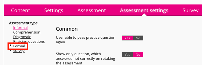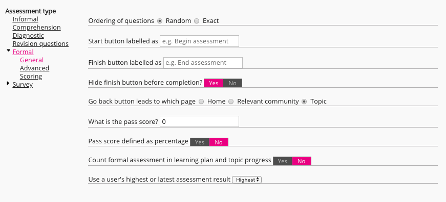 Select the desired configuration options for the formal assessment. This includes being able to change the order in which questions appear, customise button labels, adding user instructions, and adjust scoring. For more information on the configuration options available, see Assessment settings.