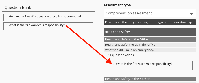 Please note that there are two distinct ways of attaching questions to chapters/items of content within assessments. If you drag and drop each question over the title of a chapter/item of content, each question is listed individually, and it becomes mandatory for users to answer each question that is listed. If you drag and drop each question on top of one another, they will be grouped together underneath the chapter/item of content, which results in users being asked one of these questions at random. For more information, see Adding a question to a chapter/item of content.