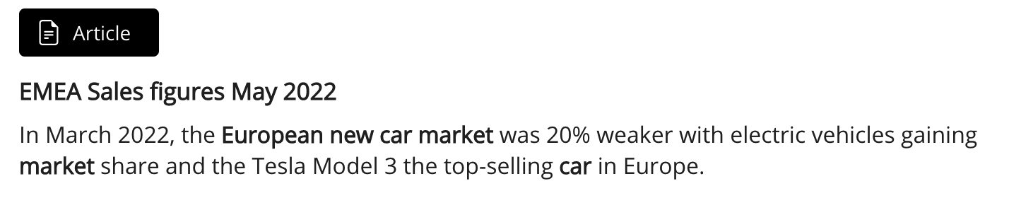 Body text: In March 2022, the European new car market was 20% weaker with electric vehicles gaining market share and the Tesla Model 3 the top-selling car in Europe. New passenger vehicle registrations in Europe contracted by a fifth in March 2022 with new car sales down 11% during the first quarter of 2022 to the lowest levels seen since 1985. Electrified cars continued to gain market share and again outsold diesel vehicles in Europe in March 2022. The Tesla Model 3 was the top-selling car model and the best-selling battery-electric vehicle in Europe in March 2022 but the Peugeot 208 was Europe’s favorite car during the first quarter of the year.