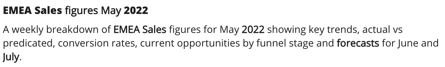Description: A weekly breakdown of EMEA Sales figures for May 2022 showing key trends, actual vs predicated, conversion rates, current opportunities by funnel stage and forecasts for June and July.