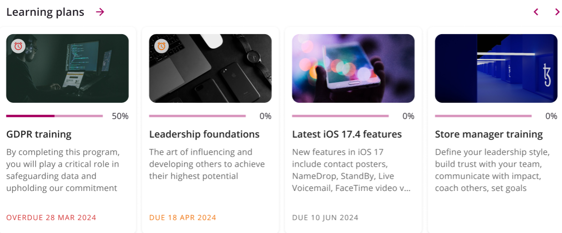 Carousel: The content is shown to users in a movable carousel of learning plan cards: