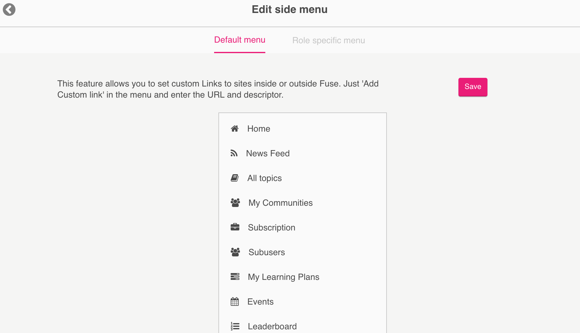 The Edit side menu screen on the Admin Panel allows admins to customise labels on and add custom links to the sidebar.