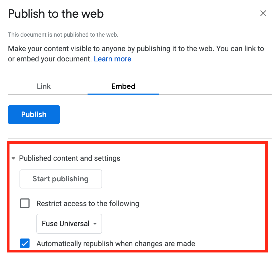 Steps 1-6 below explain how to generate an embed code for Google Docs/Sheets. Many other products can also generate embed codes, including Microsoft Office/365. Once You have generated an embed code for the external content, you can follow steps 7-11 to embed that content in Fuse.