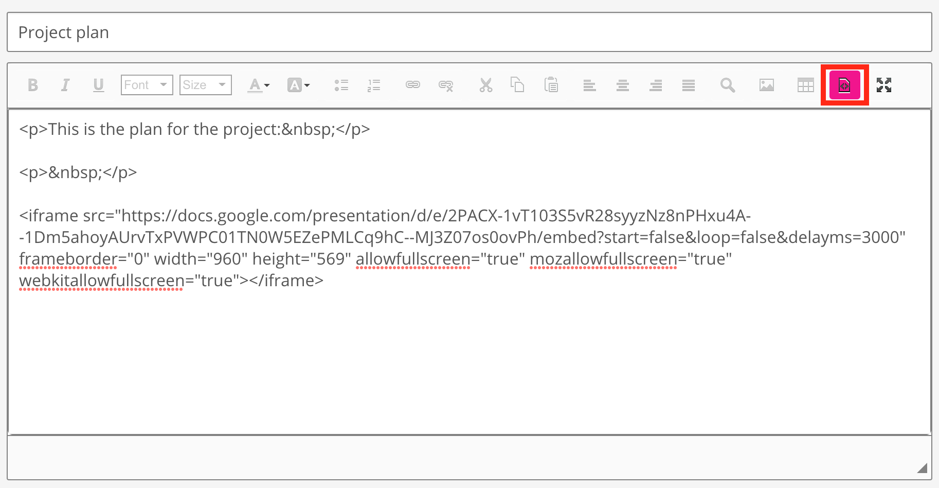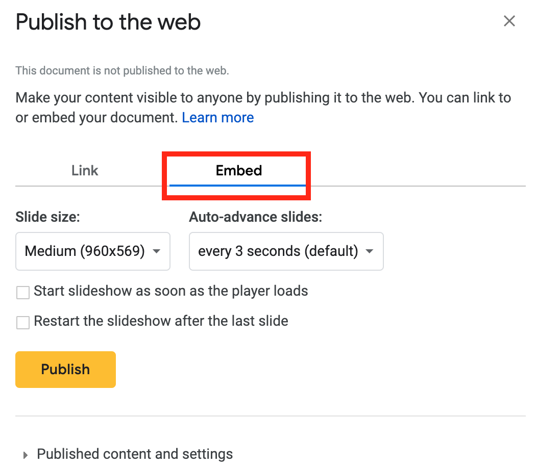 Steps 1-7 below explain how to generate an embed code for Google Slides. Many other products can also generate embed codes, including Microsoft Office/365. Once You have generated an embed code for the external content, you can follow steps 8-12 to embed that content in Fuse.