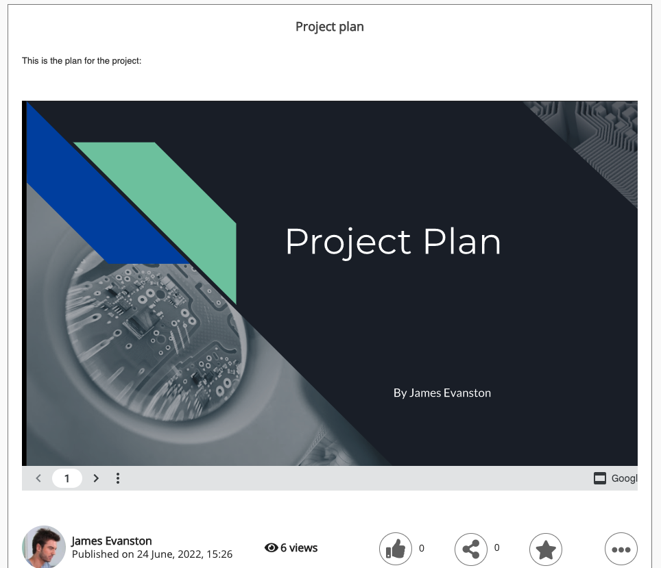 You can embed external content, such as Google Sheets, Google Docs, and Google Slides in Fuse articles using an embed code. When a file such as a Google Sheet, Doc or Slide is embedded in an article, users are presented with a live view. If changes are made to the file at the source, it is reflected in Fuse immediately, meaning users always see an up-to-date version.