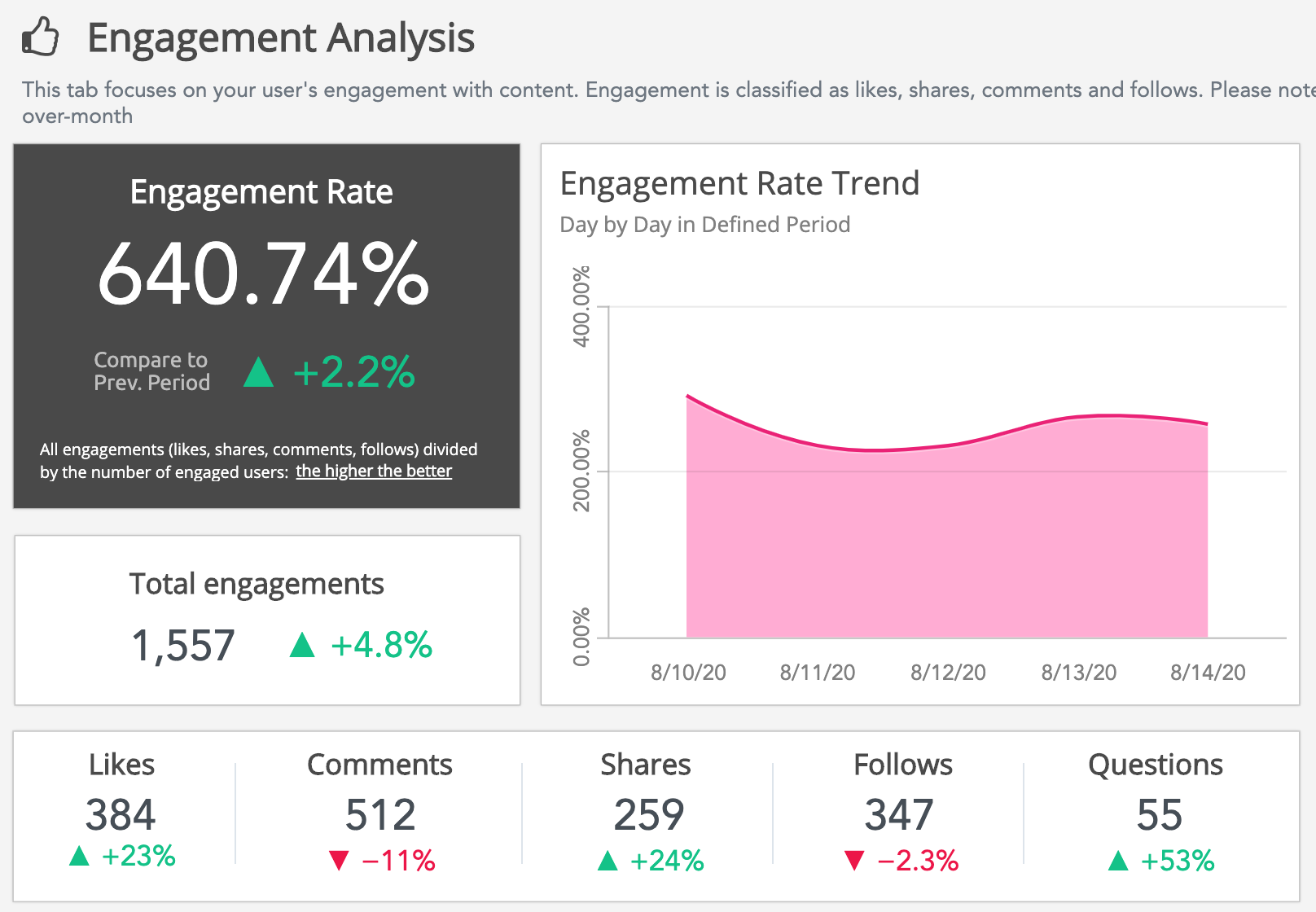 The Engagement Analysis section in the Engagement tab, shows insights and trends related to your user's engagement with content, such as the number of likes, comments, shares, and follows, as well as the number of questions posted.