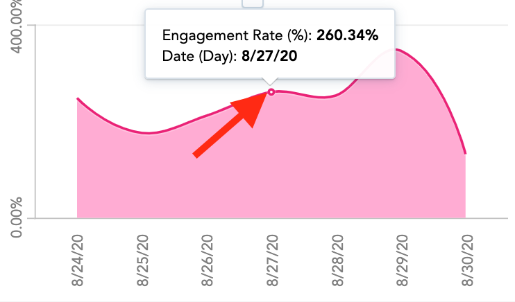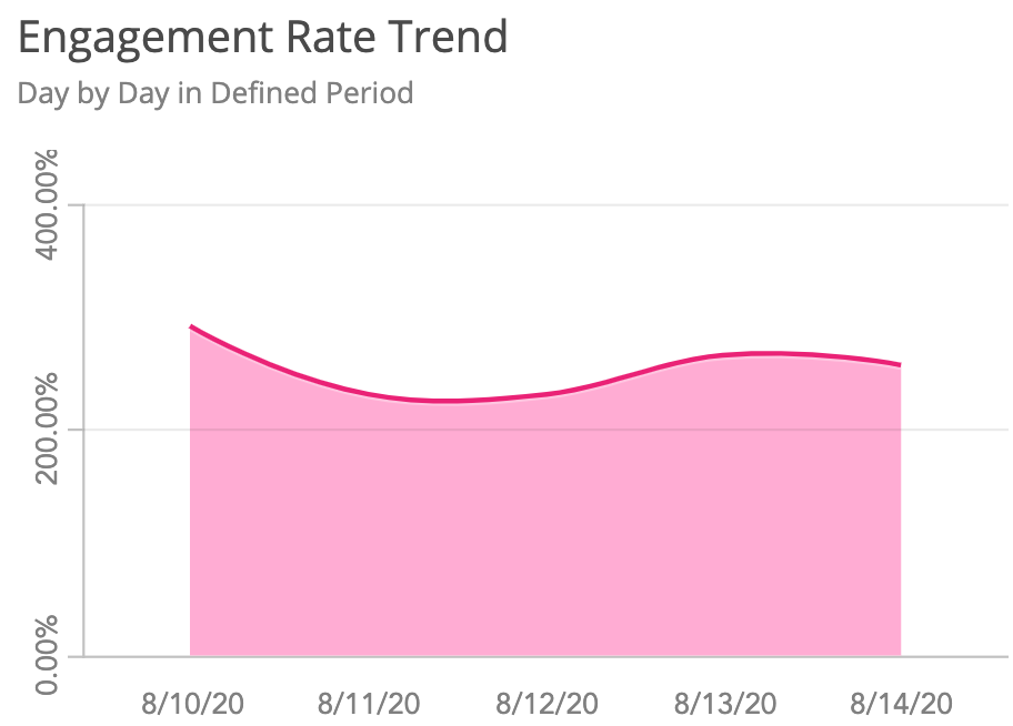 Engagement Rate Trend | Shows the engagement rate day by day over a 7 day period, based on the time period selected in the TIME PERIOD filter in the Filter By section. ![]() Hover over the line on the graph to see the engagement rate for a specific day. ![]() |