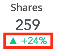 Shares | Shows how many times users have shared content in the Fuse instance, based on the filters selected in the Filter By section. Users can share knowledge with each other by sharing an item of content. Sharing knowledge is indication of great learning culture in an organisation. You can also see upward/downward trends. In the example below, the number of content shares has increased by 24% when compared to the same time 30 days prior. This means the number of shares has increased by 62, when compared to the same time 30 days before. ![]() |