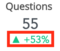 Questions | Shows how many times users have posted questions in the Fuse instance, based on filters selected in the Filter By section. Questions are a great way to understand and identify knowledge gaps within your audience. If users repeatedly post the same/similar question, it shows there is a lack of knowledge in that particular subject area. Questions also allow users to learn from each other by actively answering each other's questions. You can also see upward/downward trends. In the example below, the number of users posting questions has increased by 53%, when compared to the same time 30 days prior. This means the number of questions has increased by 29, when compared to the same time 30 days before. ![]() |
