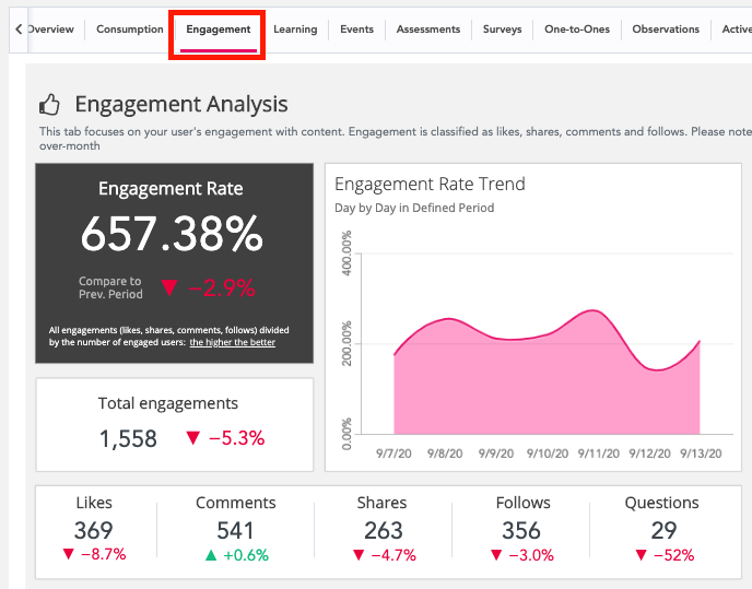 The Engagement tab displays insights related to user and community engagement with content, based on filters selected in the Filter By section. This data can help you continuously improve the content posted to Fuse, as well as inform your organisation's overall content strategy. If content is exciting, interesting and useful, your users are more likely to converse about it, share it, and engage with it.