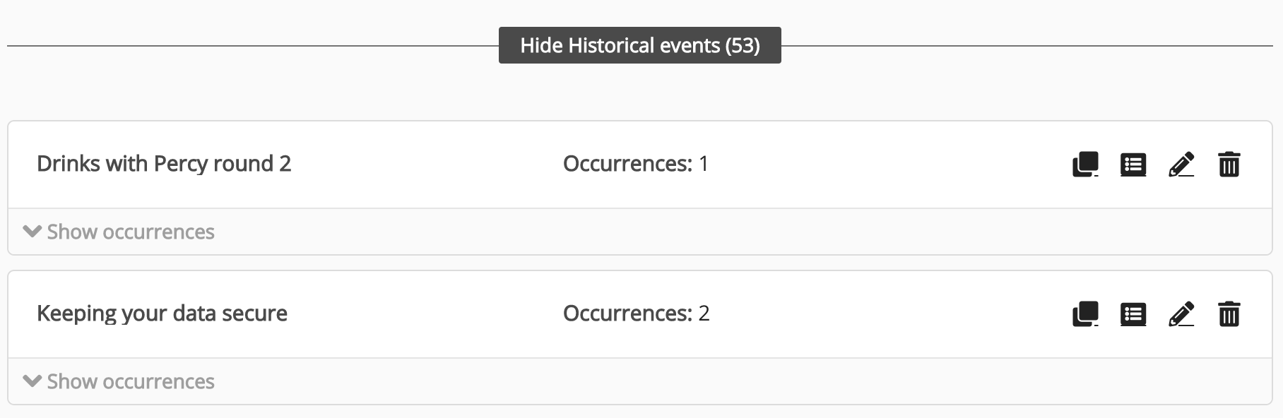 Edit ![]() | This opens the occurrence management screen, where you can manage and edit the details of your chosen occurrence. ![]() For more information on the occurrence management screen, as well as the settings and tabs available, see, Managing event occurrences. ![]() |