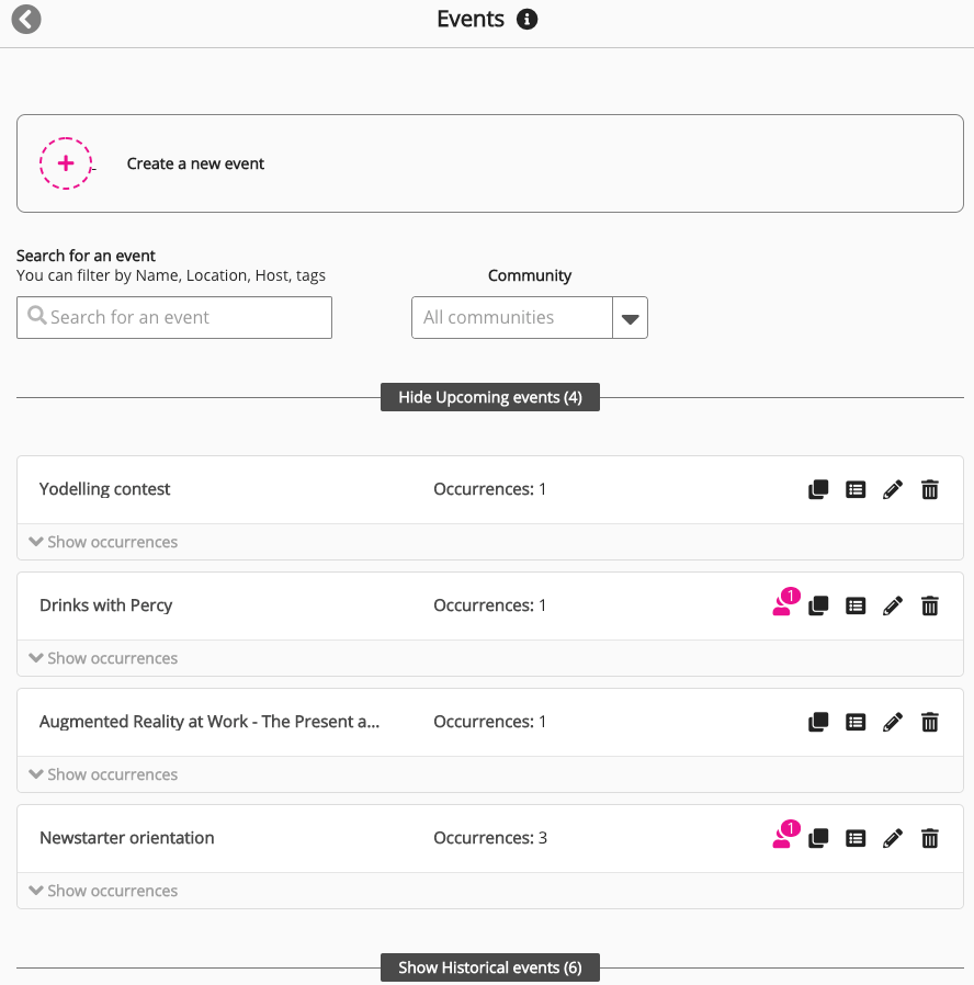 Show Historical events (#) / Hide Historical events (#) | Click Show Historical events (#) to display all historical events on the company instance or selected community. Click Hide Historical events (#) to hide all historical events on the company instance or selected community. ![]() |