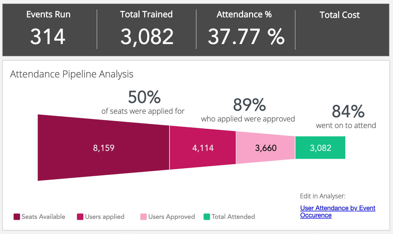 This data also tells you which events hold the most value and which ones do not. For example, if an event is continuously oversubscribed, you might want to create more occurrences for the event, in order to meet high demand. If an event is consistently undersubscribed, you might want to create fewer of these or even stop creating them altogether. In some cases, you might find that the format of an event either increases or decreases the number of attendees. For example, digital events might prove more popular and cost effective than in-person events, which could be used to build a strong case for digital learning.