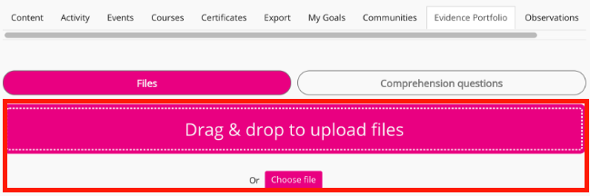 Using the Drag & drop to upload files / Choose file options in the Evidence Portfolio tab.