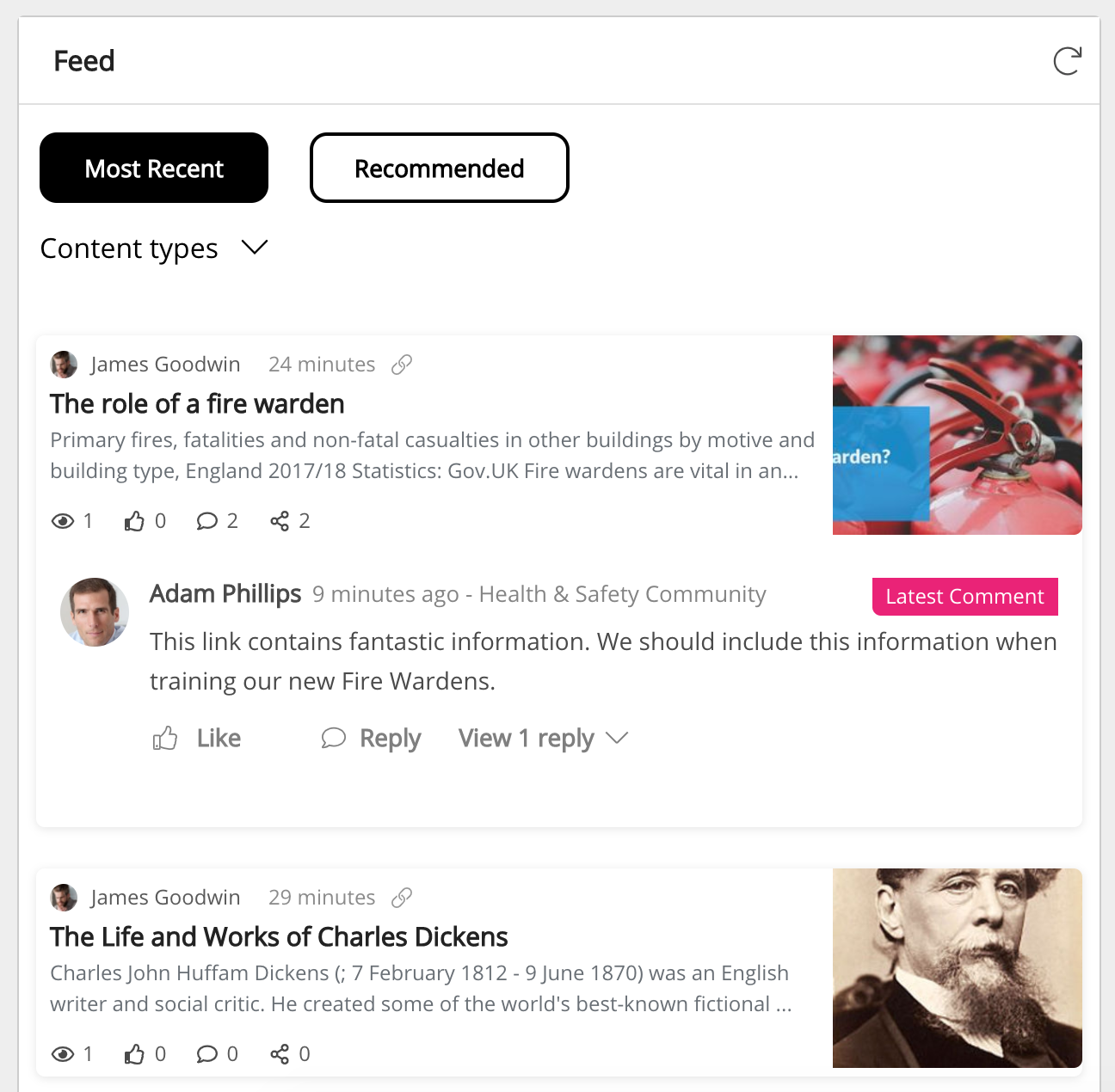 The Feed widget allows you to add a social feed to pages in Fuse, in which users can view, like, and comment on items of content posted in communities they belong to. Users can filter the feed so that it is more relevant to them, as well as dismiss content they no longer wish to see.