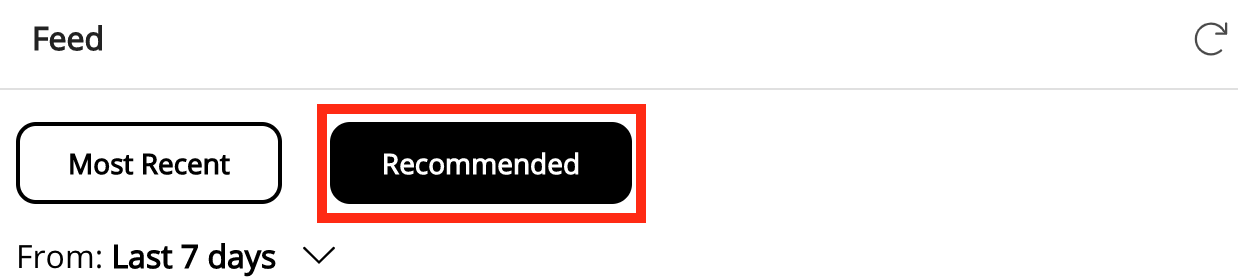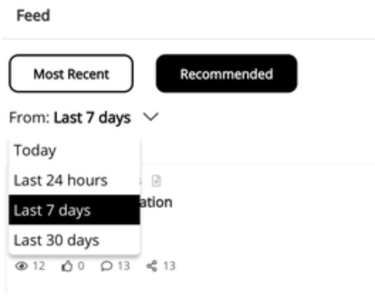 Recommended | Shows recommended content from communities you are a member of, based on the number of likes, views, shares, and comments, with the most popular content at the top of the feed. ![]() Content you have personally posted is not included in the Recommended list. Only content posted by other users is shown. Content shown in Recommended can be filtered by time period. For example, you might only want to see content posted in the last 24 hours. You can also filter the list of content by time period. To do this, click the From dropdown and select a time period. ![]() The following time periods can be selected from the dropdown: 7 days is selected by default, when you first view the Recommended list. Currently, this only applies to the browser version and not to the social feed on the mobile app.