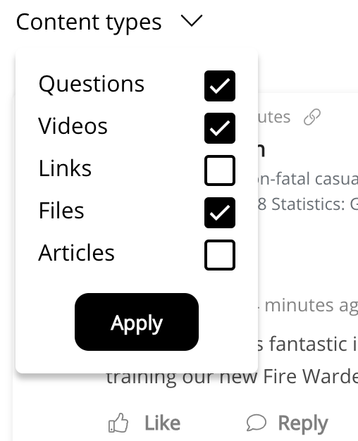 You can filter the Most Recent list so that only certain content types are displayed. For example, if you only want to display questions, videos and files, select the Questions, Videos, and Files checkboxes. Your selected content type filters are remembered whilst you are logged in or until you change them. For example, if you filter the feed to only show Questions and Videos, this will be the default until you log out of Fuse or purposefully change your selection during the session. To filter the feed by content type: