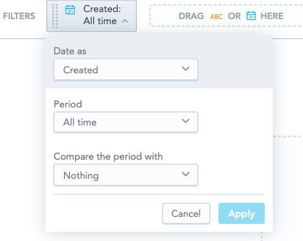 When an attribute or the Date metric is dragged into the Filters section, it is automatically applied to the data in your insight. Clicking the Funnel icon in the Filters section, reveals a dropdown which allows you to exclude any of these attributes or the Date metric, by deselecting the checkbox next to it.